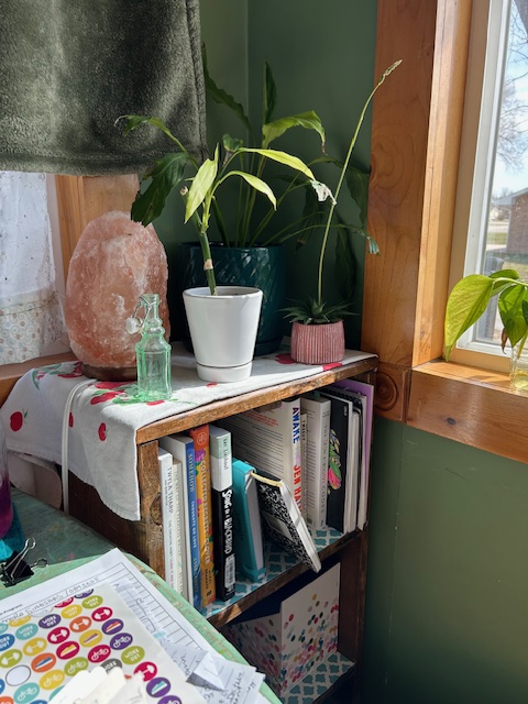 I feel inspired by this little plant that sits to the right of me at my green writing desk. The desk still has colorful splotches on it from when my kiddos used to paint when they were little. I’ve never cleaned it off all that well as I think the messes we make can strangely be the most beautiful things.
